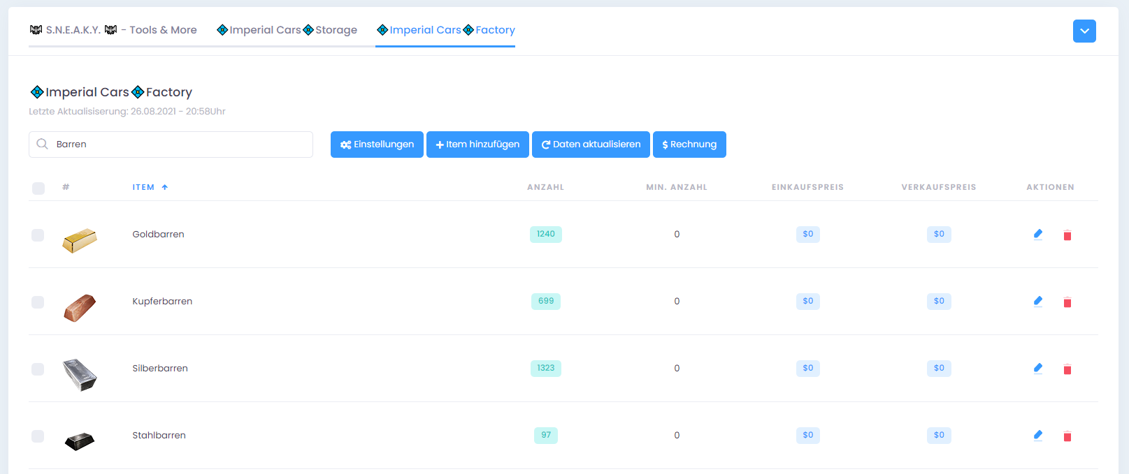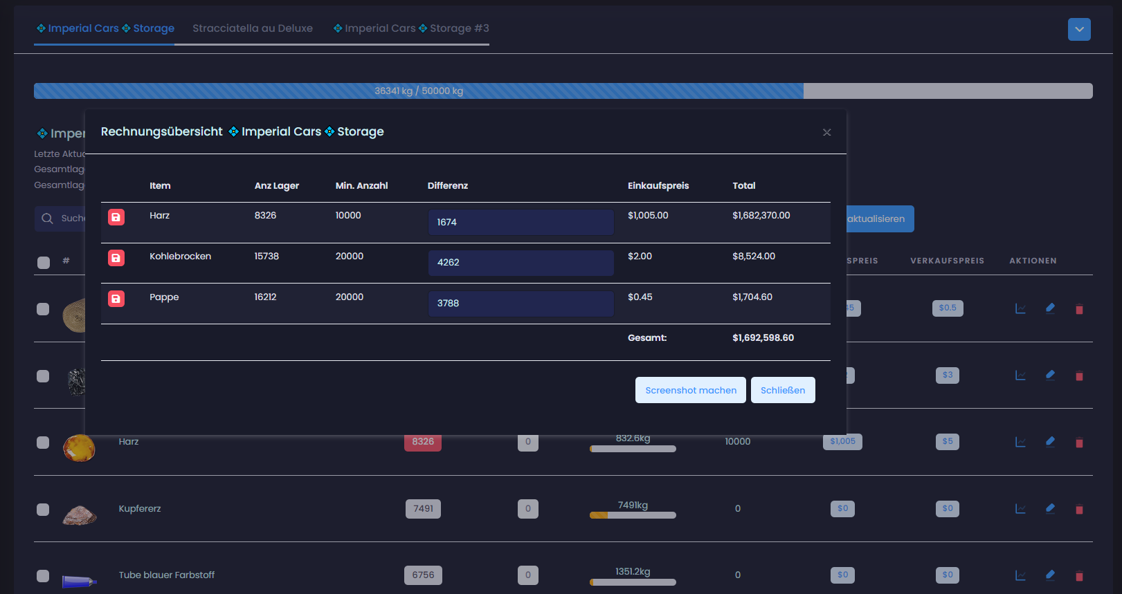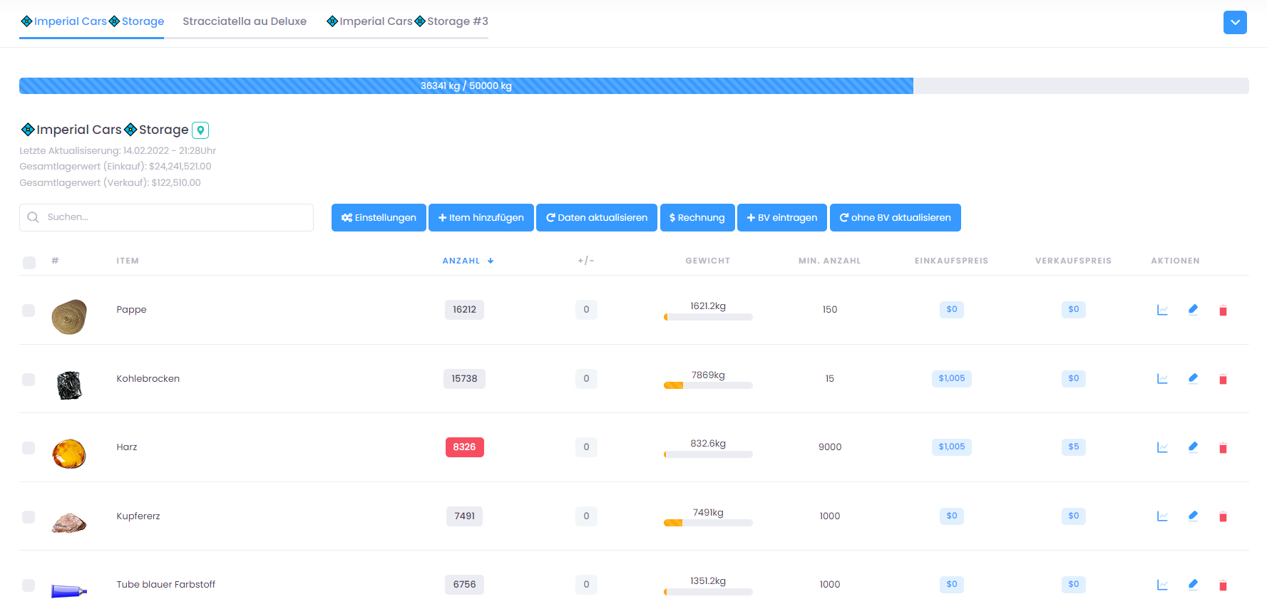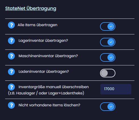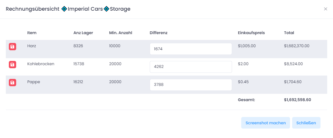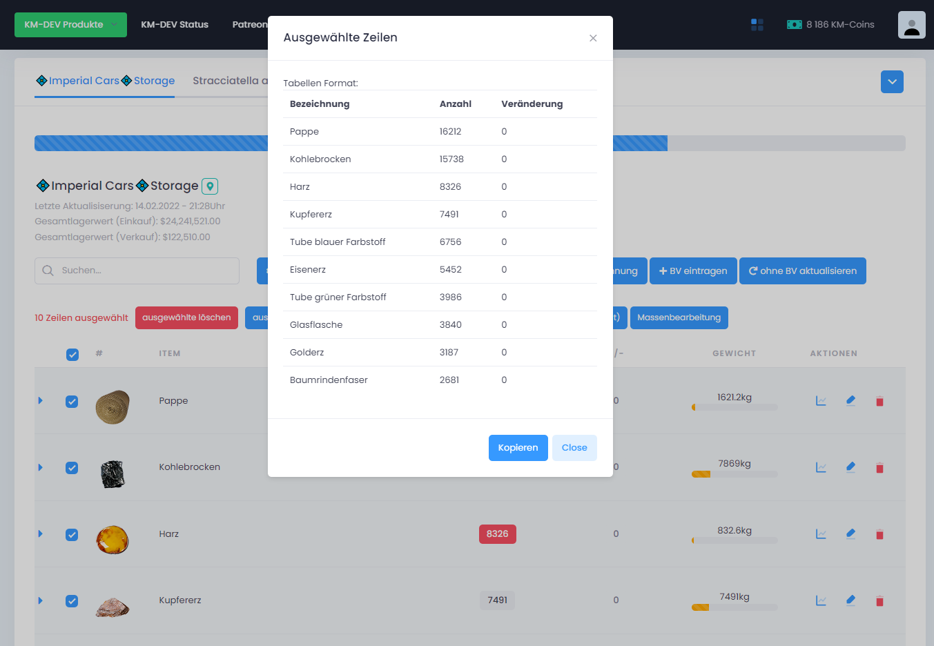 Transferiere auf Knopfdruck den aktuellen Lager- & (Thekenbestand) zu KM-DEV. Behalte so den Überblick über deine vorhandenen Items mit deren Anzahl und Gewicht. Entscheide selbst ob du alle Items übertragen möchtest oder nur festgelegte von dir. Konfiguriere für jedes Item individuell oder über die Massenbearbeitung z.B. den Mindestbestand. Die Suchfunktion ermöglicht es dir schnell und einfach dein gesuchtes Item zu finden.