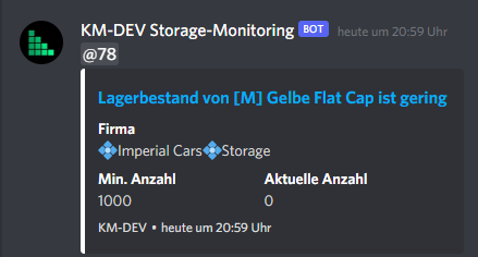 Bleibe auf dem laufenden, sobald ein Gut unter deinen Mindestwert fällt. Lege pro Item ein Mindestbestand fest und ob du eine Benachrichtung willst oder nicht. Die Nachricht erhälsts du in deinem eigenen Discord Channel, zu dem du auch weitere Nutzer hinzufügen kannst.