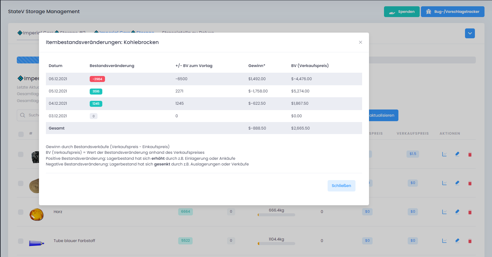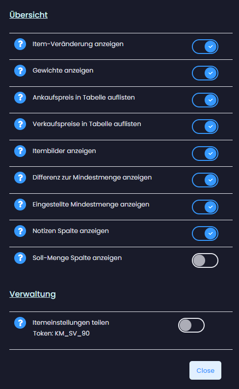 Wähle die gewünschten Items aus und lasse die eine Tabelle oder Text zum kopieren ausgeben. So kannst du deine Bestände einfach per Chat mit jedem teilen. Kein Aufwändiges Formatieren mehr nötig.